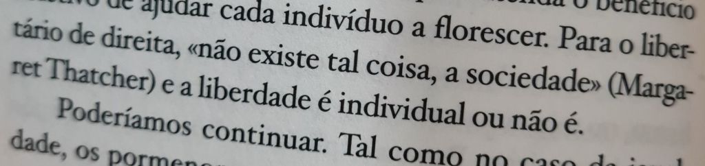 “For the right-wing libertarian “there’s no such thing as society” (Margaret Thatcher) and liberty is individual or not at all”. And “Não existe tal coisa” is the key phrase meaning “there’s no such thing as”