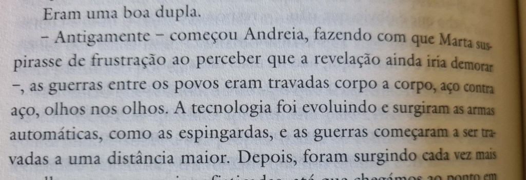 “A long time ago” began Andreia, causing Marta to sigh with frustration, as she realised that the the revelation would be delayed, “wars between peoples were fought body-to-body, steel against steel, eye to eye. Technology kept evolving and automatic weapons arose, like rifles and wars began to be fought at a distance. “