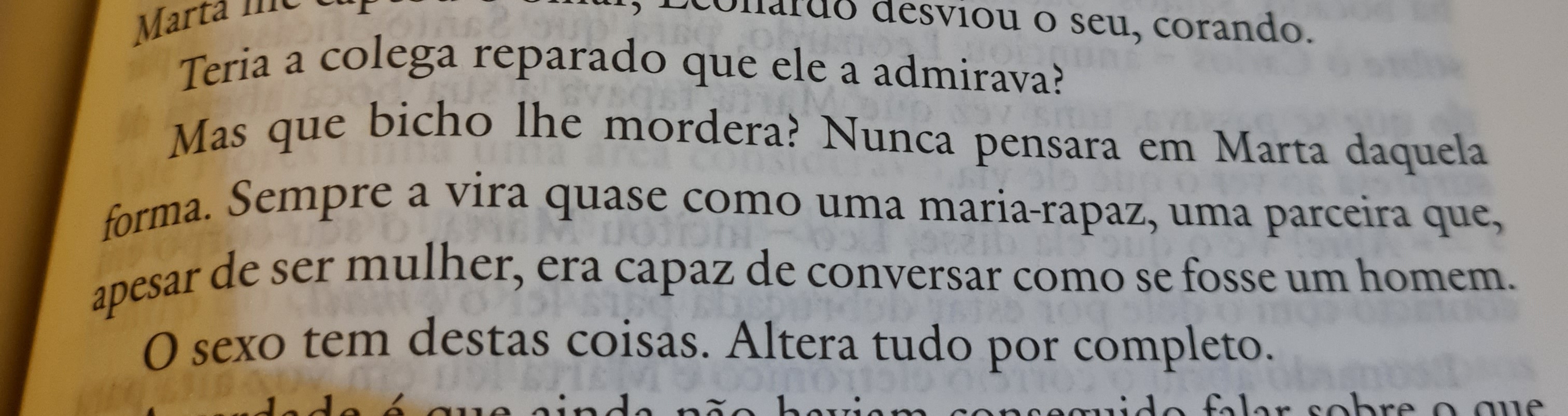 But what creature had bitten him? He had never thought about Marta that way. He had always seen her as like a Maria-rapaz, a partner who, although she was a woman, was able to talk like a man.