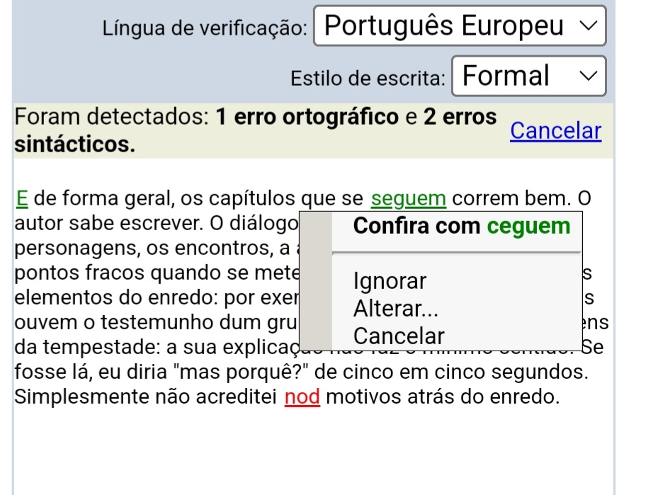 Like any computer program, it’s not immune to errors though. Today’s text includes the phrase “os capítulos que se seguem” (“the following chapters”). Computer said no, advising me to say “the chapters that blind themselves” instead.