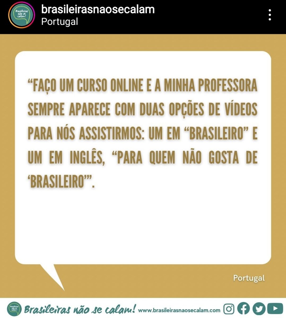 From the comments, the reason for the complaint is that some people find the use of “brasileiro” in place of “português de Brasil” to be evidence of hatred, and the fact that she thinks some people might prefer to hear a foreign language rather than a São Paulo accent just adds insult to injury. This seems a little over-sensitive, but more importantly, I think it’s pretty obvious that there are plenty of alternative explanations for why English is being offered alongside Brazilian. For example, Portugal has a pretty good record of welcoming refugees and asylum seekers from Syria, Venezuela and Ukraine, among others. It must be a hard transition for those people to make given how much harder it is to learn portuguese than English. Of course it’s not practical to have videos in every language, but English is practically a universal esperanto these days, and it seems very likely that someone who is still struggling to learn portuguese might find it easier to follow an English language video than one that is in a strong, unfamiliar accent.