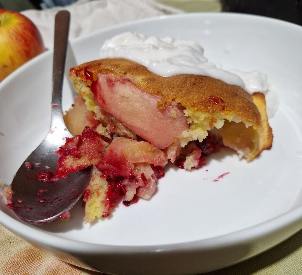 Falei deste prato numa aula uns dias atrás e decidi fazê-lo. Mudei a receita um pouco porque tinha uma mão-cheia de amoras que colhi na horta, mas é geralmente feita com maçãs com uma camada de massa de bolo no topo. É muito simples mas delicioso. Quem me dera ter nata em vez de iogurte.