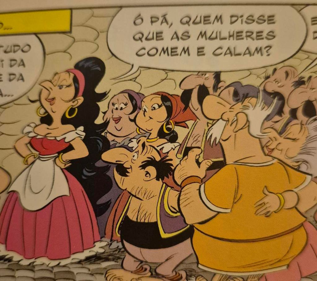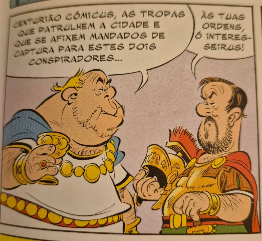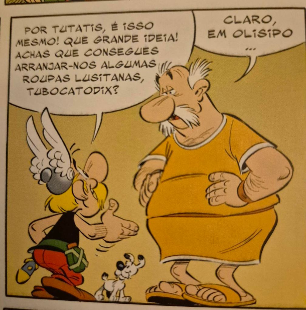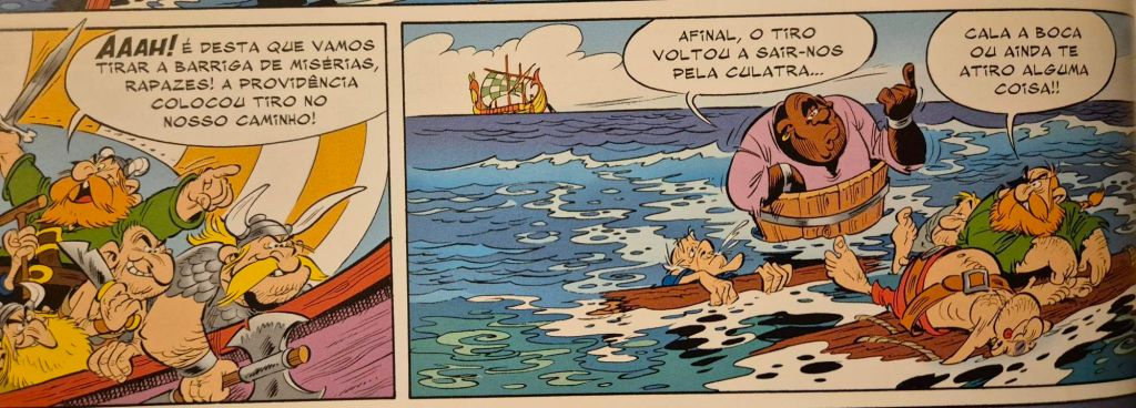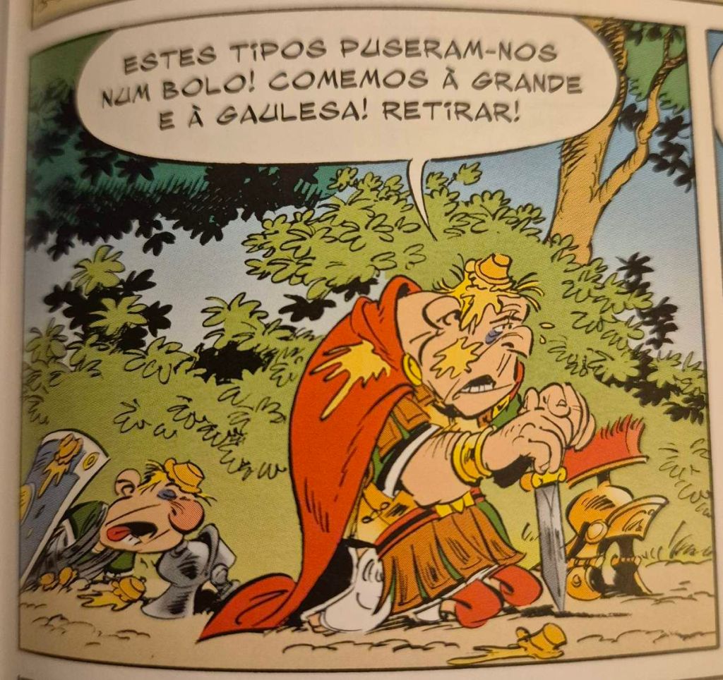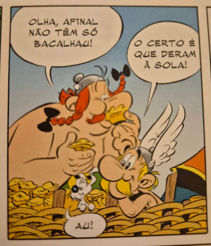 And straight after that, is this another joke? Dar à sola means to run away and the “sola” there means the sole of your foot. I want it to be a pun based on the fact that Obélix is talking about cod (of which he is not a fan!) and sole can also be a kind of fish. It doesn’t quite work in Portuguese though because the words are slightly different: sola for the sole of your foot and solha for the flat fish.