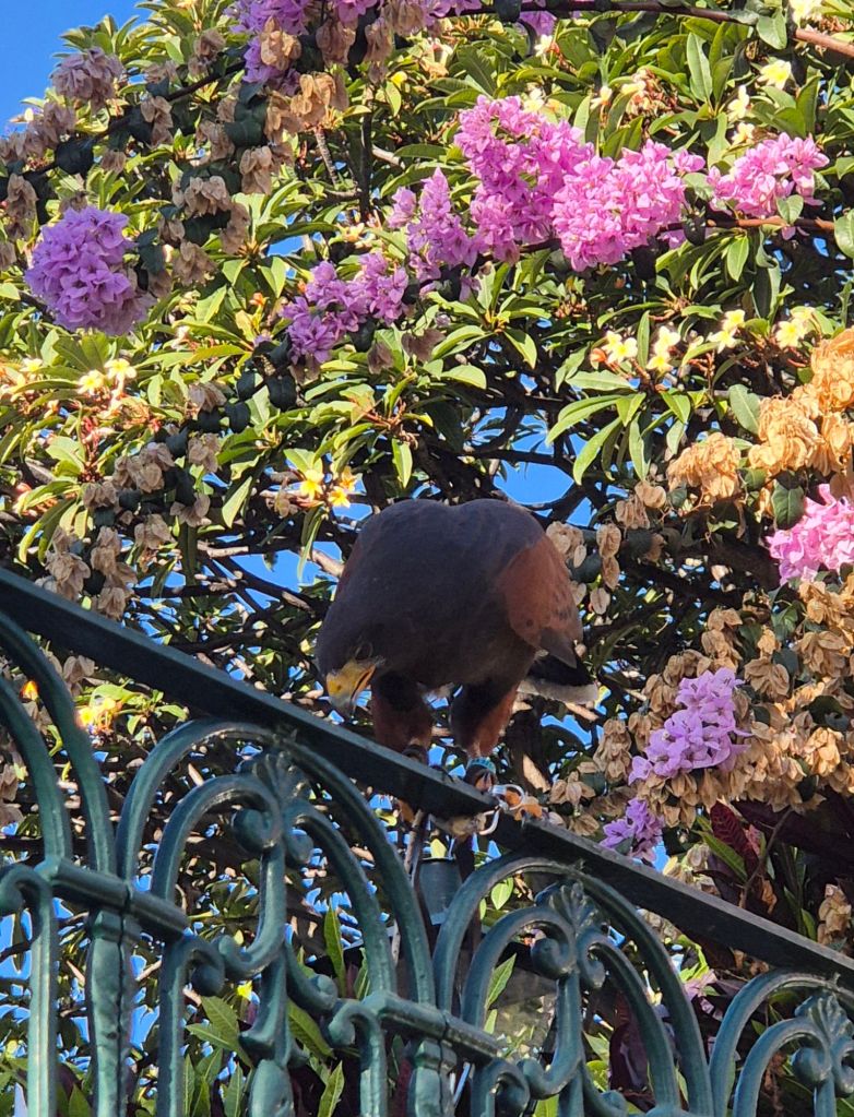 Mas o hotel tem uma arma segreda: uma ave de rapina. Infelizmente não está solta; acho o espectáculo de uma pomba a ser degolada entre as cereais seria ainda mais horripilante do que a alternativa, mas está empoleirada num corrimão, perto das mesas, com um homem a cuidar dela. E a ameaça da ave de rapina dissuade, em certa medida, as pombas cometerem atrocidades.