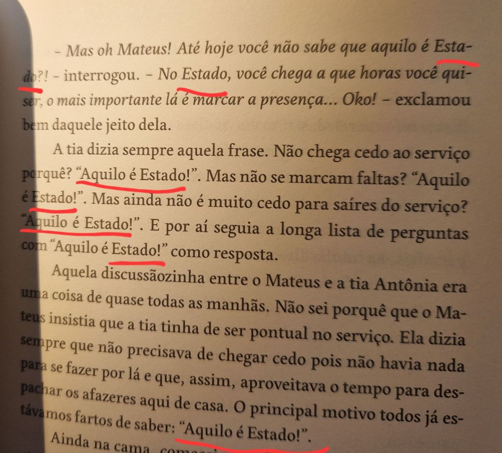 Mais uma expressão encontrada no meu romance angolano, “E O Céu Mudou de Cor”. Durante uma conversa entre a tia e o irmão do narrador e o filho dela, ela anda a repetir a expressão “aquilo é Estado”, com letra maiúscula na última palavra. Fiquei ligeiramente confuso porque não entendi o que significa Estado neste contexto, mas após ter perguntado à minha professora, e depois pedido conselho aos sábios do Reddit, parece-me óbvio, e mal acredito que o achei difícil.