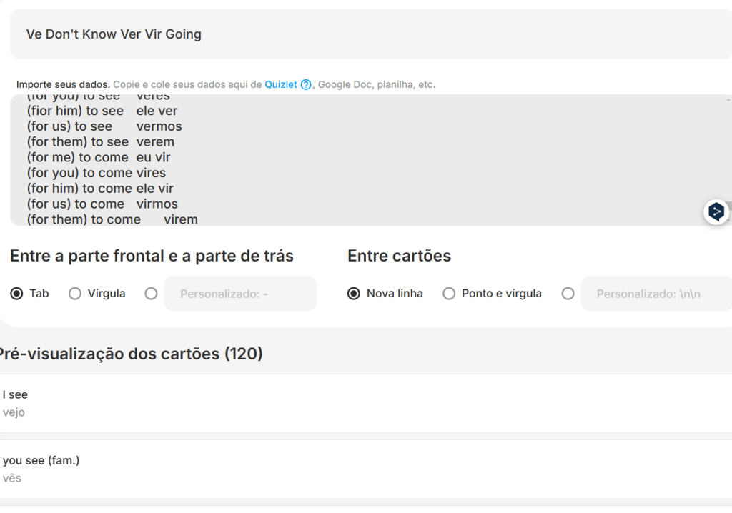 • It will automatically take the pairings and create a course from them – check the image below, showing a course for remembering the various conjugations of ver and vir. You can see at the bottom of the picture, what it is interpreting as the prompt and answer and it seemed to get them all right first time, which is nice!