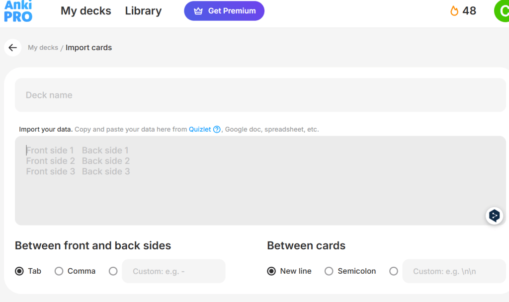• Go to this screen (which you get to by creating a new deck then choosing “import cards!” and then “csv”)