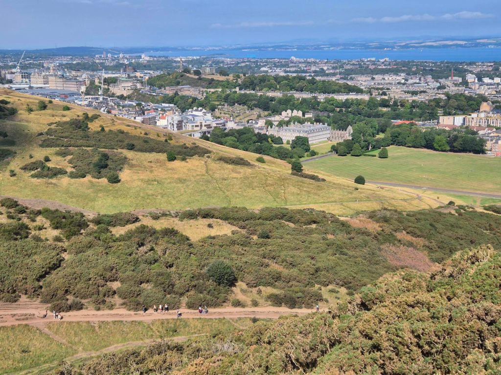 A corrida de sábado foi mais curta mas igualmente desafiante. Fui de pé para o parco da Holyrood* e depois subi o “Arthur’s Seat” que é uma coluna de basalto composto das magmas congeladas na garganta dum antigo vulcão. Infelizmente havia lá tantas mas tantas turistas que não me apetecia correr ao longo do caminho ao píncaro, portanto escolhi uma divagação para uma colina mas baixa, mesmo ao lado e depois atravessei o patamar, subindo e descendendo as inclinações o mais rápido possível.