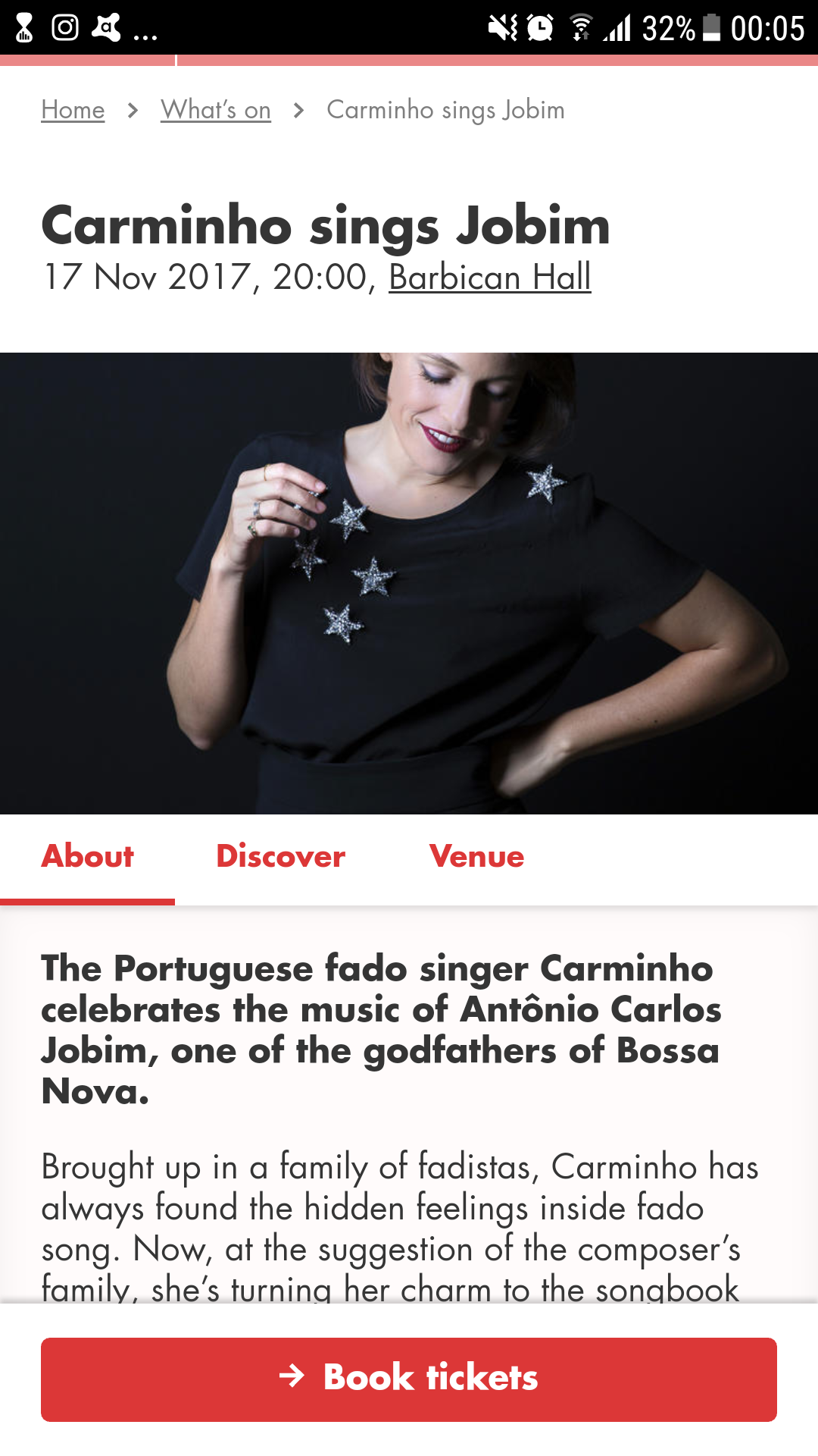 Hoje, fui até ao Barbican Centre para ver um concerto de música lusófona de Portugal e do Brasil. A fadista Carminho está quase ao fim dum série de concertos nos quais ela canta as obras de Tom Jobim. Lamento que não tenho um grande conhecimento de musica brasileira, mas conheço o nome de Jobim, e dois membros da banda tinham o mesmo nome porque são os netos dele (ou.. Um neto e um filho…? Não sei…) além duma baterista e do violoncelista Jaques Morelenbaum.