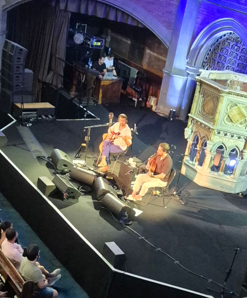 Eu e a minha esposa estamos no Union Chapel, uma igreja que também serve para sala de concertos . Os cantautores Miguel Araújo e António Zambujo estão a cantar juntos. Estamos no intervalo entra a primeira metade e a segunda.