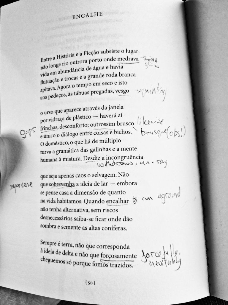 It’s Atirar Para o Torto by Margarida Vale de Gato. Just about every page brings me a whole crop of obscure vocabulary. It makes it hard to get absorbed in the flow. I underlined the mysterious strangers on this page because there were so many I couldn’t keep track. Some are obvious (“forçosamente”,”desdiz”), others I’d seen before but couldn’t remember (“frincha”) and others are total mysteries (“vesgo”). Outrossim looks like it’s combining ‘outro’ and ‘assim’ but it’s “likewise” (another one like that) rather than what I thought at first: “otherwise” (like something else entirely)