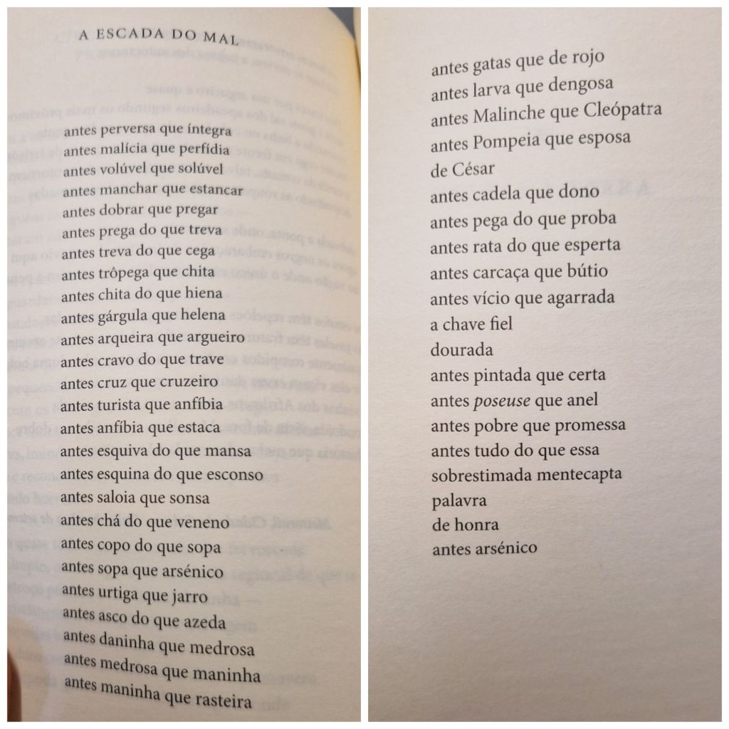 Someone or other once said that poetry isn’t a puzzle to be solved, but it annoys me to see someone clearly doing something clever and I don’t understand it so I thought I’d dig into this one and see what was going on. It’s from Atirar Para o Torto.