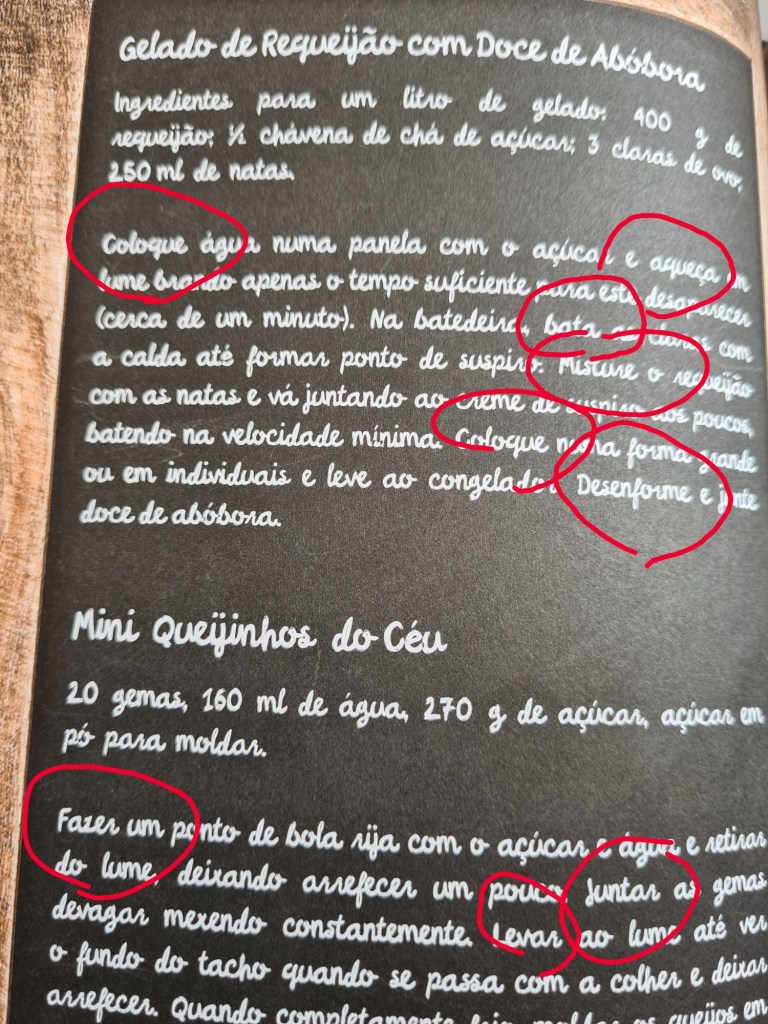 ***=what tense to use for the steps in a recipe or an instruction manual is more complicated than in English. It’s not just “do this, do that, because that tense (the imperative) has both a singular and a plural form and of course formal and informal too. This is using singular imperative, as if I were giving instructions to one person, but for example you can find someone here writing instructions and clearly imagining herself addressing a group of readers using the plural imperative. There doesn’t seem to be much reason to choose one form over the other, apart from just whether you want to want to come across like a classroom teacher (addressing people as a group) or a coach (making each reader feel like you are addressing them directly). To complicate things even further, it’s also possible to write the entire text in infinitives. You can see a good example of this in a single page of a beautiful book called Viagens Pelas Receitas de Portugal By Nelson Carvalheiro.
