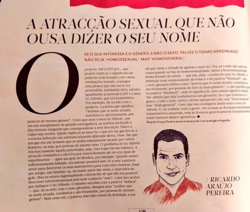 O humorista Ricardo Araújo Pereira tornou-se alvo de críticas anteontem por ter escrito sobre uma série de outdoors lançada pela Fox Life através da sua marca ABCLGBTQIA+. Ele sublinhou o excesso de pudor dos desenhadores que definiu palavras como “homossexual” em termos de atração “romântica” e “afetiva” sem mencionar o sexo. Afirmou que esta definição não indisporia o seu “Tio Alfredo” (cuja existência tenho alguma dúvida mas na escrita do humorista é representativa de homens homofóbicos em geral) mas omite algo indispensável do significado desta palavra.