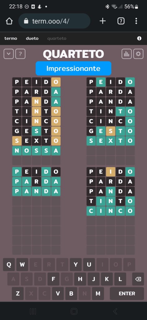 Gosto de jogar “Termo” enquanto tomo o pequeno-almoço. Depois de completar o jogo principal, faço a versão “Dueto” e a “Quarteto”. Hoje fiz um erro parvo na “Quarteto”. Já identificara as letras 1,2,3 e 5 (não digo quais as letras para não dar spoilers!) . Só precisava de adivinhar mais uma letra para preencher o último espaço. Infelizmente, havia várias opções de palavras possíveis, dependendo da quarta letra. Podia ser uma R, V, C, T, D… Hum… Provavelmente haveria ainda mais opções.