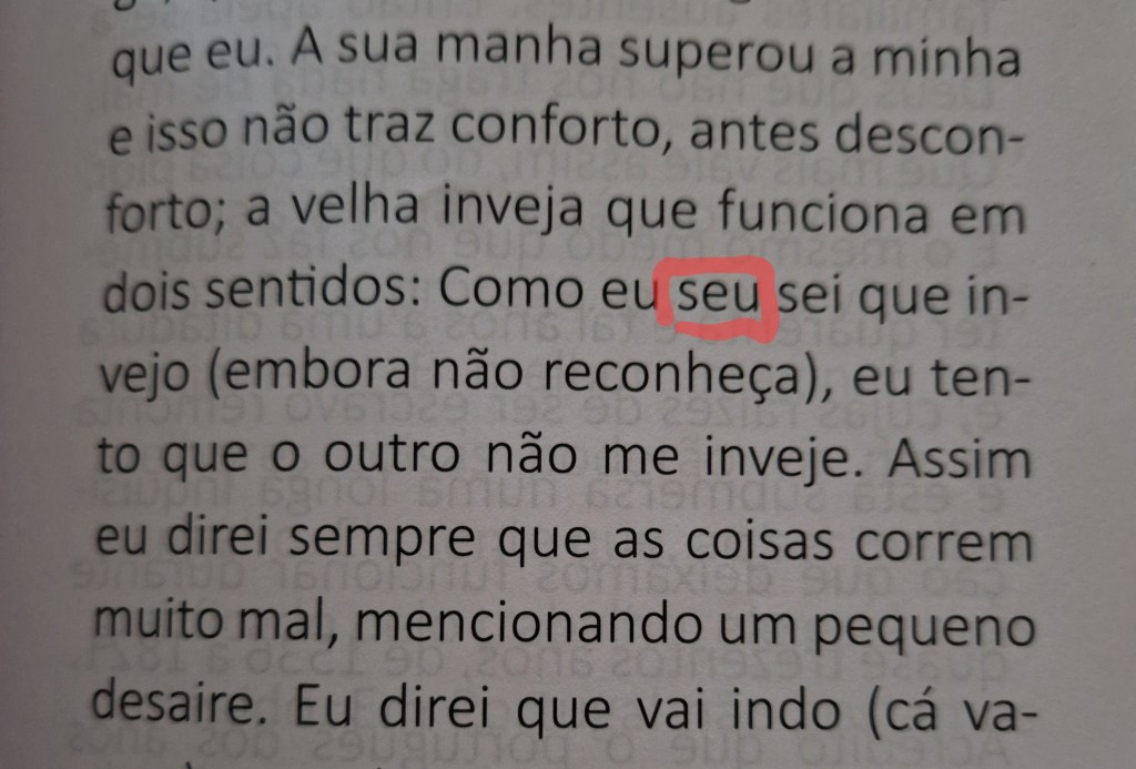 Typos tend to be annoying at the best of times, but they can be super-confusing when they come up in portuguese texts because you don’t know if they are real typos or if it’s just some aspect of the language that you’re not familiar with. I was pretty sure about this one but had to go and ask. It is one of course. The fact that the stray “seu” is right next to the right word, “sei”, makes it obvious how it happened.