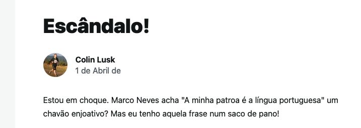 But it’s OK, because an eagle-eyed reader who spotted the mistake told me it still worked because patroa, the feminine form of “patrão” can also mean “wife“, just as in english you might hear blokey blokes refer to “the boss” or “she who must be obeyed” or whatever. And I’m married to someone who speaks a língua portuguesa, albeit with an accent the mainlanders sometimes affect not to understand, so I’ll just point to the publication date, 1 Abril, and pass it off as a joke. Yes, I am clever and funny and I never, ever make typos.